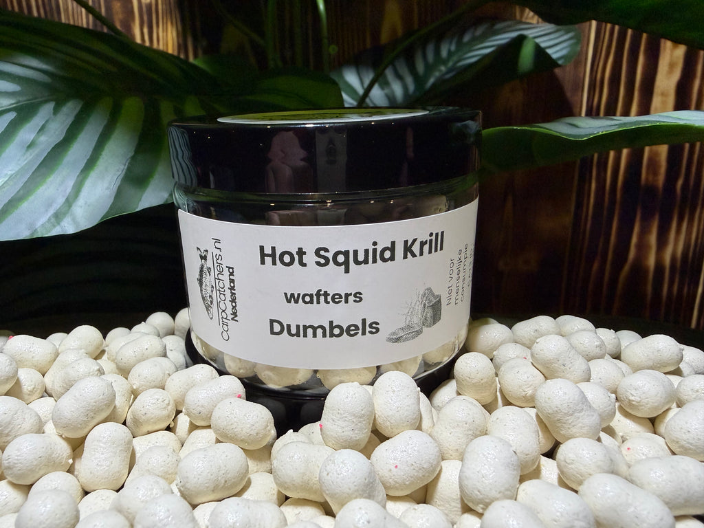 De Hot Squid Krill Wafters Dumbells zijn kleine, subtiel gebalanceerde wafters met een krachtige squid- en krill flavour. Deze witte dumbell wafters zijn speciaal ontwikkeld voor het vissen op dressuurgevoelige karpers, waarbij een natuurlijke en lichte presentatie het verschil kan maken.